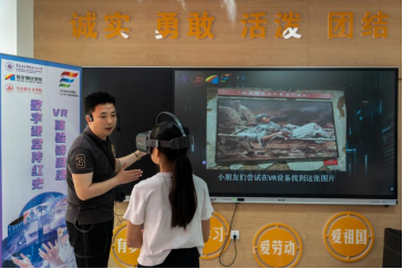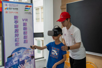 (志愿者引导“数字小侠”使用VR一体机)