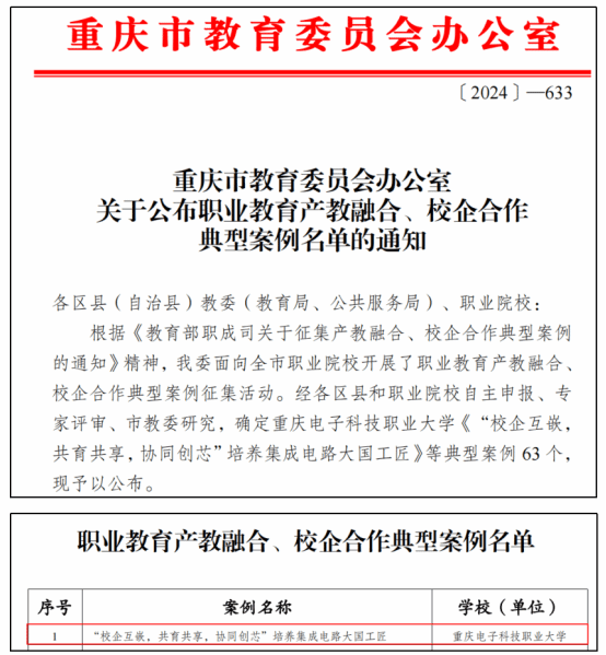 2024年11月12日,重庆市教育委员会办公室发布了《关于公布职业教育产教融合、校企合作典型案例名单的通知》(图1),我校申报的《“校企互嵌,共育共享,协同创芯”培养集成电路大国工匠》成功入选。