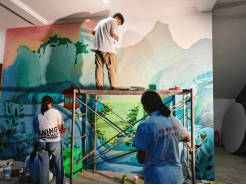 以乡村美景为材,保护非遗尽展艺术魅力。实践团充分发挥自己的专业特长和创意灵感,围绕清升镇美景,结合专业所长,将古佛山、金龙湖等精心设计墙绘内容。团队师生们走访研究了清升镇乡村特色景点,以墙为布、以笔传情,绘制出一副绿水青山,和美田园的美丽乡村的美丽画卷。