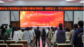 而后,数字媒体学院吴艾佳书记带领第一届团总支·学生会全体负责人宣誓。誓言庄重,期许未来,每一个字都掷地有声,提醒着全体干部要时刻牢记身份、以身作则,传承优良传统,认真履行职责,为学校职业教育的高质量发展贡献力量。