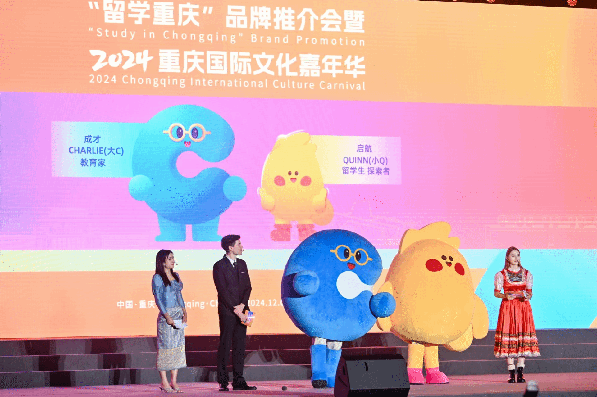 开幕式上中外学生带来的表演,为现场观众呈现一场来全球的文化盛宴。“留学重庆”宣传大使分享了自己在重庆留学生活的点点滴滴与亲身感悟,向现场观众介绍了“留学重庆”LOGO和吉祥物“大C小Q”,展现“留学重庆”全新品牌形象。