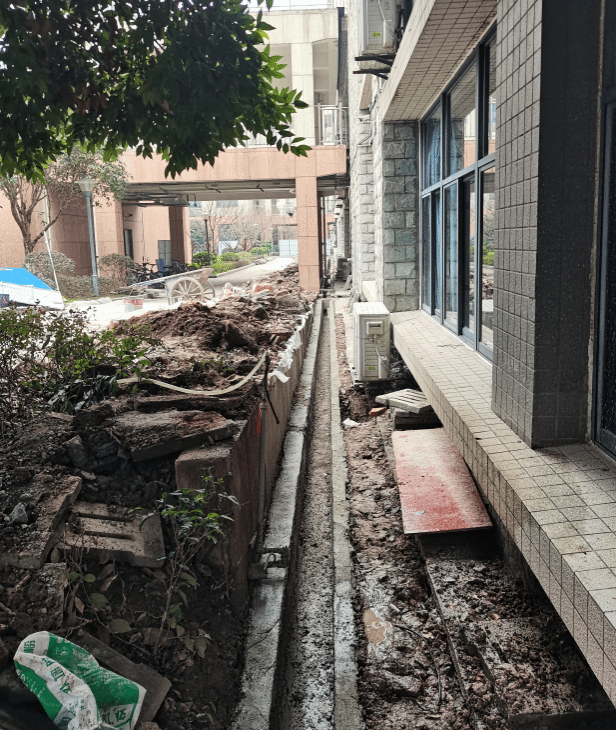 博德楼B101、B102多媒体教室地面因地势原因长年存在渗水问题,经过后勤多次实地踏勘研究,决定利用寒假教学空窗期,重新修建室外排水沟,通过标高整体下降、设置盲沟等方式,解决地面渗水不能及时排走问题,保证日常教学。