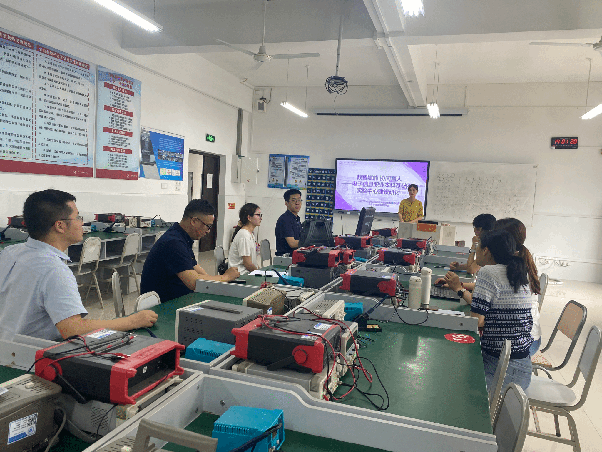 为进一步深化职业本科教育教学改革,强化我校本科专业基础课程实践教学体系建设,在2025年成渝地区双城经济圈职业教育活动周举办之际,我校电子与物联网学院基础平台教师于5月15日组织召开职业本科实验中心建设专题研讨会。研讨会邀请行业企业专家邓强、张丽,智能产品开发与应用模组陈志勇老师,以及基础平台全体教师,围绕基础平台实验中心建设规划、资源整合与开发、实践教学创新等议题展开深入探讨。