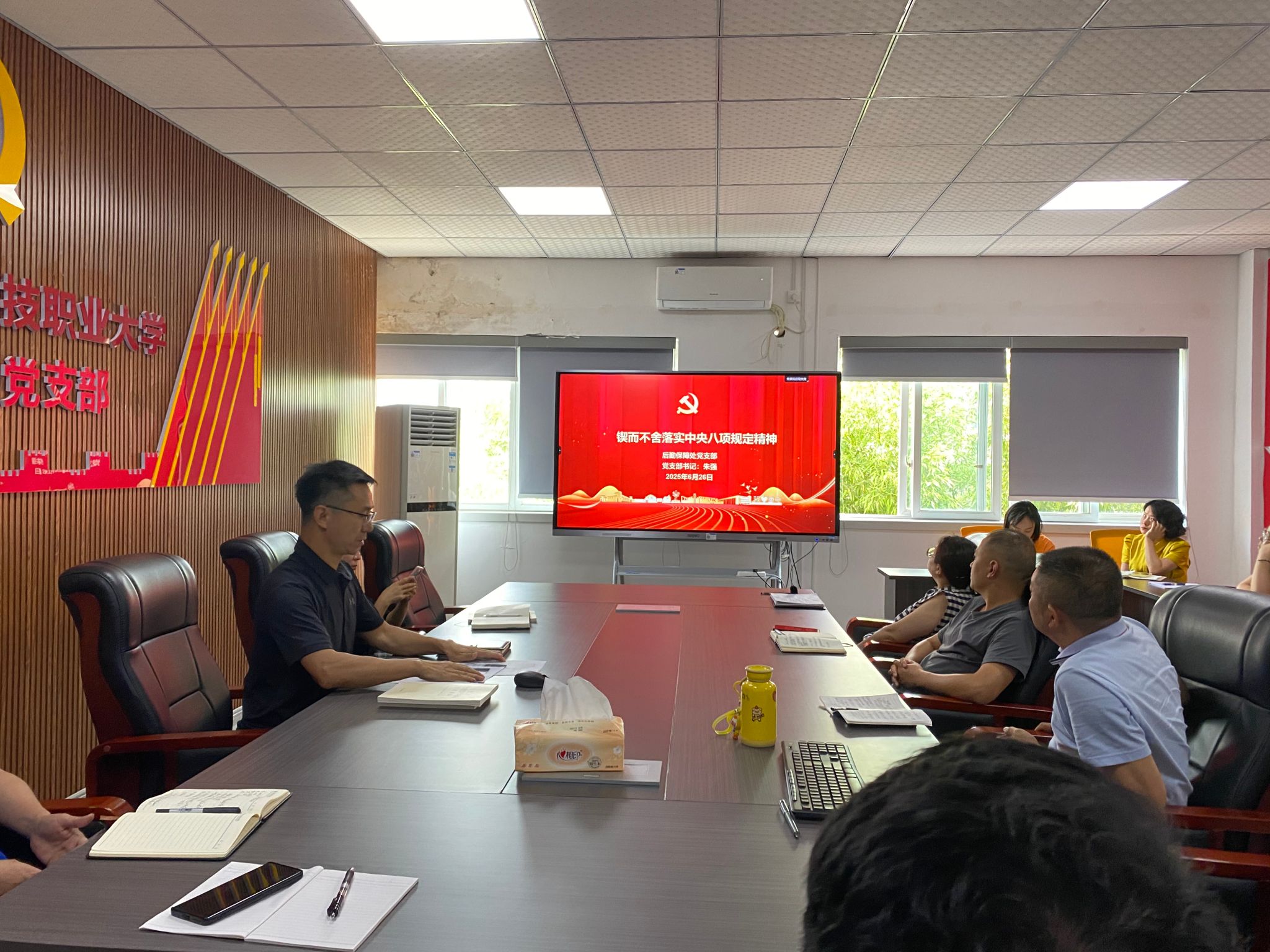 6月26日朱强以“锲而不舍落实中央八项规定精神”为题开展党课宣讲,他告诫党支部全体党员:“每一个党员怎么做,最终会影响到整个党支部的形象。每一个党员要像我们工作中铺路砌墙一样踏踏实实地去保持优良作风,锲而不舍落实中央八项规定精神,绝不能走过场、装样子。”