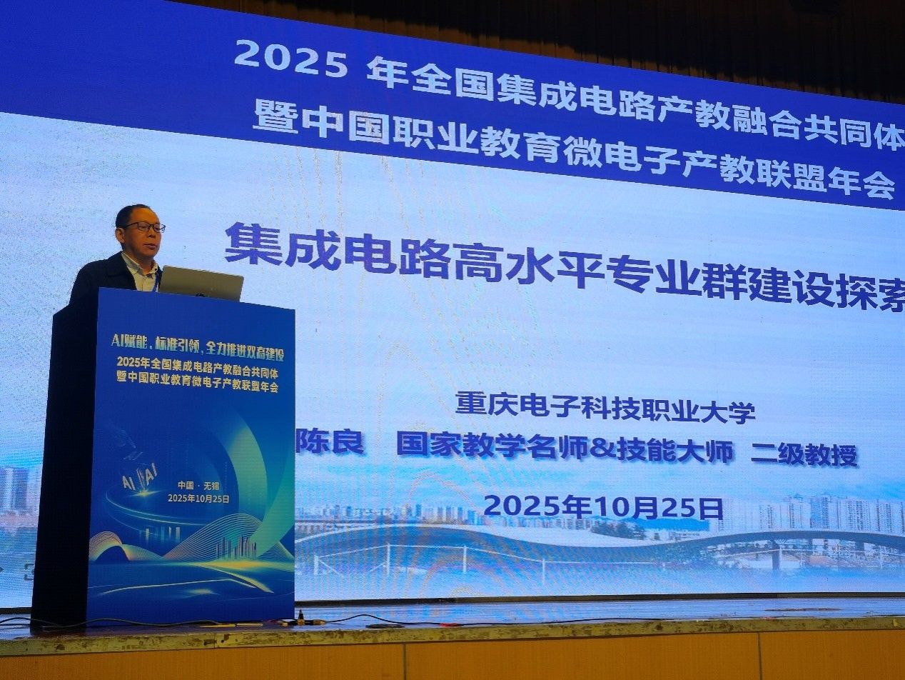 2025年10月25日,开云电子平台_开云(中国)电子与物联网学院(集成电路学院)党总支书记陈良(二级)教授受邀出席在江苏无锡举办的2025年全国集成电路产教融合共同体工作会议暨中国职业教育微电子产教联盟年会,集成电路系副主任林涛教授陪同参会。本次会议以“AI赋能、标准引领,全力推进双高建设”为主题,汇聚了全国30余家企业代表、50余所院校代表,共同探讨集成电路产教融合与高水平专业群建设路径。
