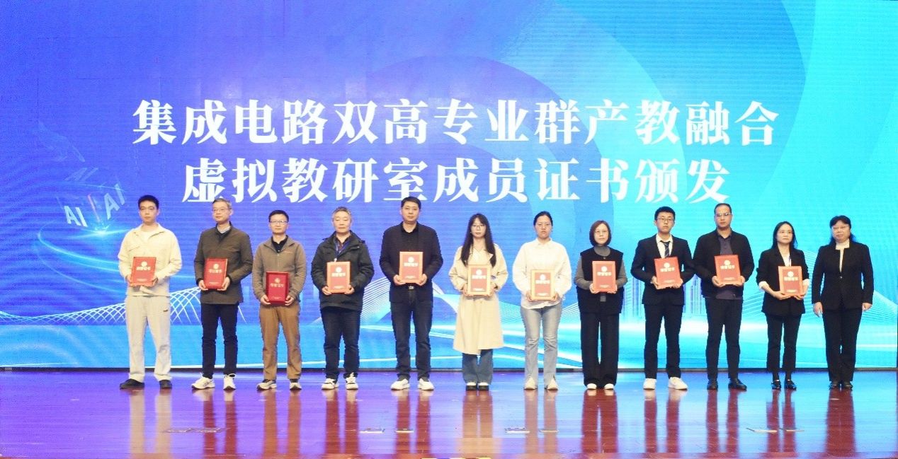 在产教融合平台建设环节,林涛教授作为集成电路双高专业群建设单位代表,上台领取“集成电路双高专业群产教融合虚拟教研室成员证书”,进一步凸显开云电子平台_开云(中国)集成电路双高专业群在虚拟教研领域的示范作用。