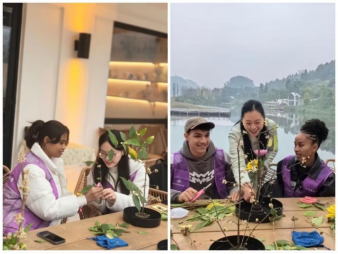 技艺如何走出雅室,点亮一方山水?师生们的脚步从腊梅花坊延伸至腊梅博览园、创新工坊和发货仓库。眼前的景象令人振奋:昔日的“案头清供”,已衍生出非遗插花课程、腊梅盆栽、腊梅鲜切花、花园民宿、鲜花首饰、腊梅文创、腊梅化妆品等完整产业链,并通过电商平台走向全国。这项非遗技艺累计培训学员过万,在当地带动近3000人就业增收。邓纪会带领乡亲们通过“兵团作战”模式,将腊梅产品销往全国各地。这不仅是中华优秀传统文化“创造性转化、创新性发展”的鲜活案例,更是中国共产党领导下实现乡村振兴、共同富裕的生动实践。邓老师表示:“非遗活化了,产业兴旺了,乡亲们的钱包鼓了,社区凝聚力也更强了。”来自马达加斯加的留学生刘夕苒惊叹:“从一朵花到一个产业,我看到了一种尊重传统、拥抱现代和市场的智慧发展模式。”参观结束后,学生们主动添加邓纪会老师的微信,约定假期再来系统学习静观插花技艺。