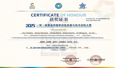 近日,2025年一带一路暨金砖国家技能发展与技术创新大赛“乡村振兴创新创业规划与设计”全国选拔赛圆满落幕。由智慧健康学院教师胡文权、余杰指导的2023级旅游管理专业学生游婷婷、张倩莹、程泽华参赛团队,斩获高职组三等奖。