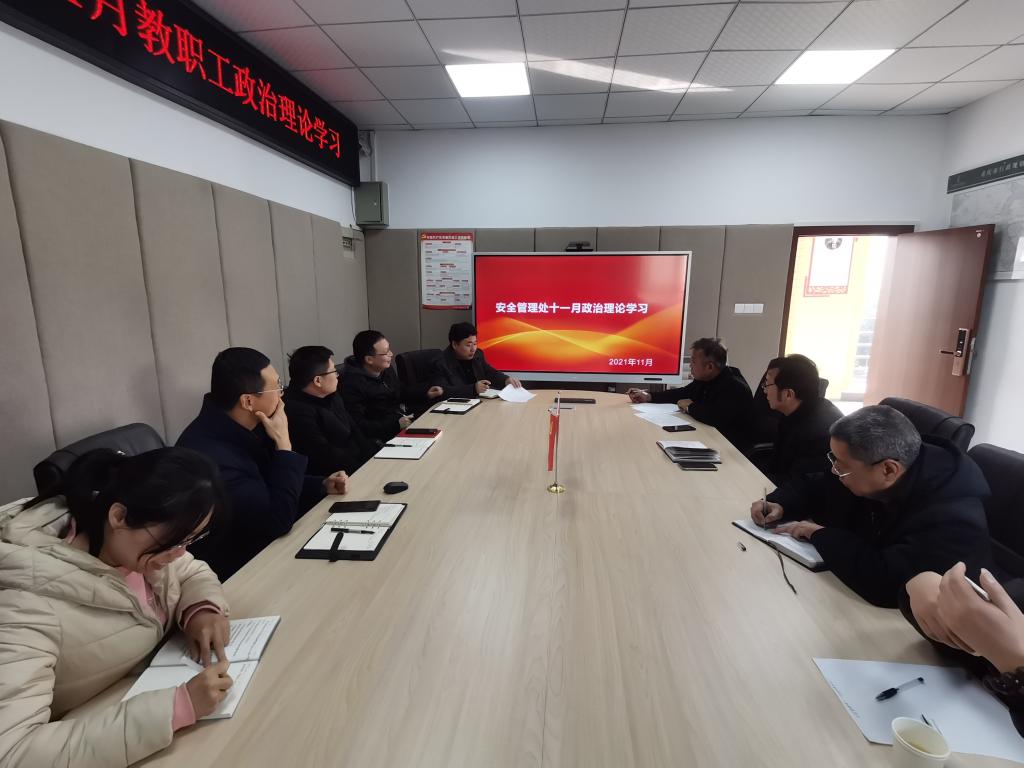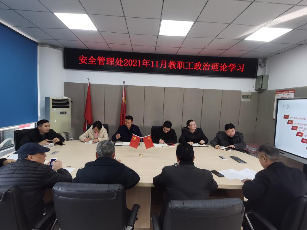 安全管理处于2021年11月26日召开教职工政治理论学习。会议学习内容包括中国共产党第十九届中央委员会第六次全体会议公报、传达学习习近平总书记在庆祝中国共产党成立100周年大会上的讲话精神、习近平总书记关于推动长江经济带发展的系列重要讲话精神、习近平总书记在省部级主要领导干部学习贯彻党的十九届五中全会精神专题研讨班开班式上的重要讲话精神、习近平主持中央政治局第二十七次集体学习时的重要讲话精神和《为什么要增强忧患意识、防范风险挑战,尤其要高度警惕”黑天鹅“和”灰犀牛“事件》。