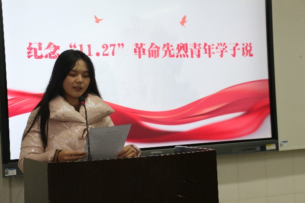 11月27日上午,建筑与材料学院师生在6202进行了“缅怀革命先烈,传承红色基因”纪念“11.27”革命先烈殉难72周年观影及演讲活动。在进行了观影活动之后,在场观影的同学积极踊跃地进行了“纪念11.27革命先烈青年学子说”演讲,并在活动结束后分享了观后感。