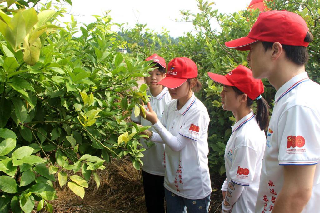 图为实践团队员了解种植规模并实地观察柠檬树长势