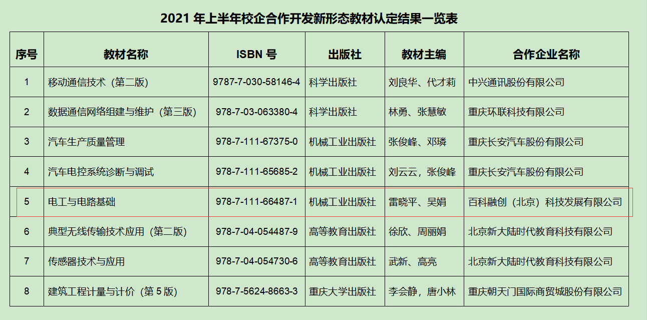 为贯彻《国家职业教育改革实施方案》,落实《职业院校教材管理办法》,规范职业院校教材的编写工作,满足办法提出的“倡导开发活页式、工作手册式新形态教材”的要求,2021年上半年,重庆电子工程职业学院启动校级校企合作开发新形态教材的认定工作,电子与物联网学院基础平台《电工与电路基础》教材在众多教材中脱颖而出,顺利被认定为校企合作开发新形态教材。