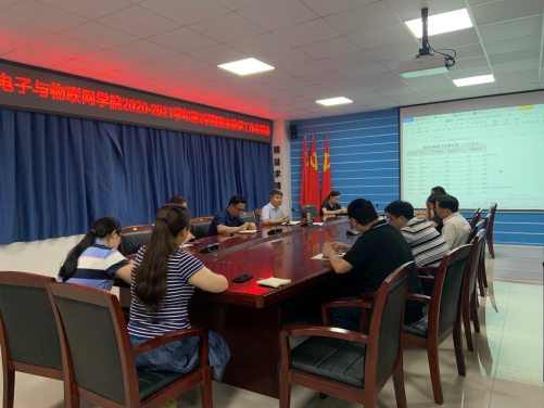 6月24日中午,电子与物联网学院在12-507B会议室召开2020-2021学年第2学期期末教学工作布置会。学院副院长夏西泉、教务科科长刘翼、各系部主任、系部教学秘书及教务科全体人员参加会议。