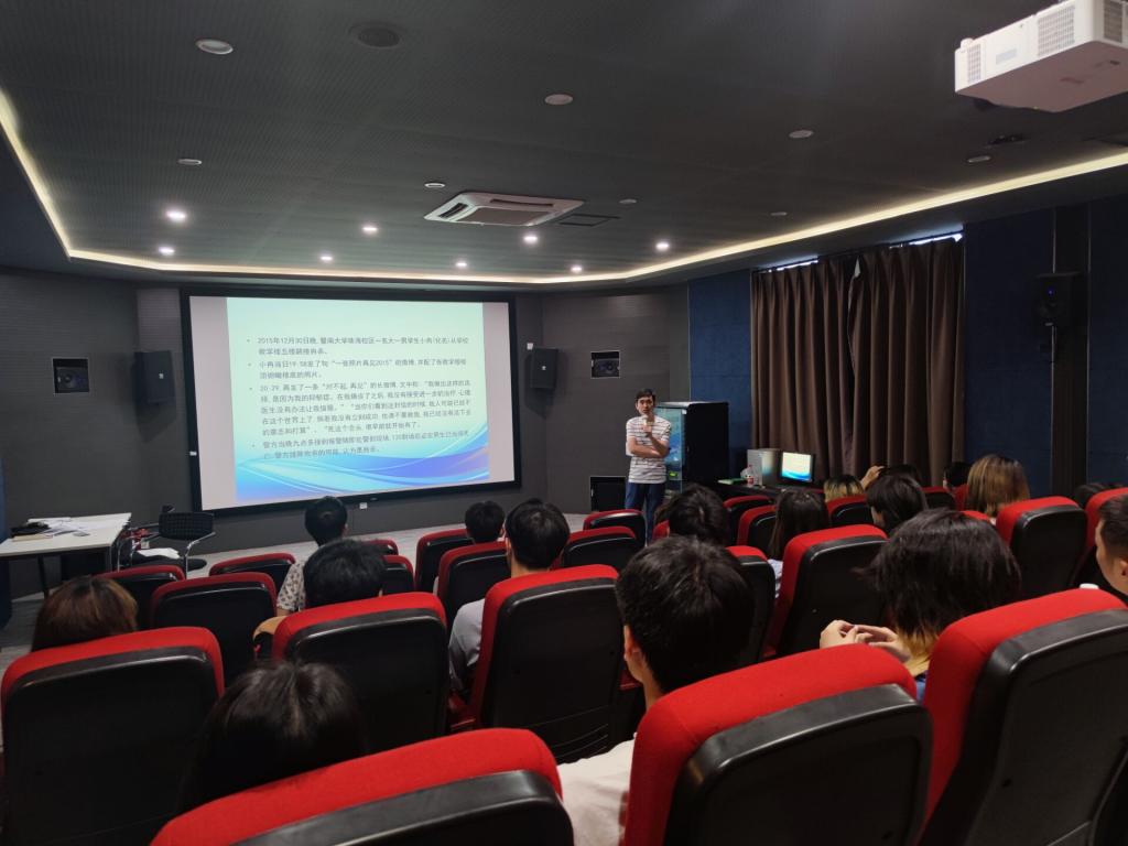 培训会上,朱文昊老师以三个大学生自杀的案例入手并结合影视作品,分析了案例中涉及到的心理健康知识和心理委员应该注意的方面。随后他详细讲解了心理委员的任务、素质、应该遵循的原则、需要重点关注的对象以及判断心理异常与否的三原则等知识,为心理委员开展下一步工作夯实了基础。