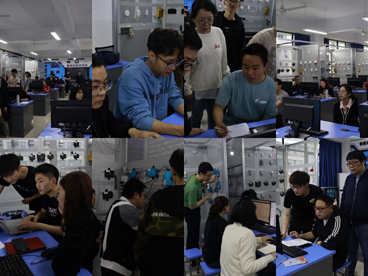 比赛采取师生混编组队方式,每组由1-2名教师和1名学生助理组成,在规定时间内共同完成相关项目任务。裁判组由信息工程系主任徐小辉教授及3名优秀学生代表执行。组委会采用超星学习通线上分组功能,快速发布竞赛任务及细则,要求各小组将比赛结果及时上传。线上分组功能能够实时保存过程数据,有效助力裁判组委会现场打分,确保了比赛的公平和公正。比赛过程紧张又有趣,教师们全身心投入参加项目,学生们则在旁边积极配合与观摩。师生共同讨论方案设计、代码调试、模块配置命令等赛项任务。