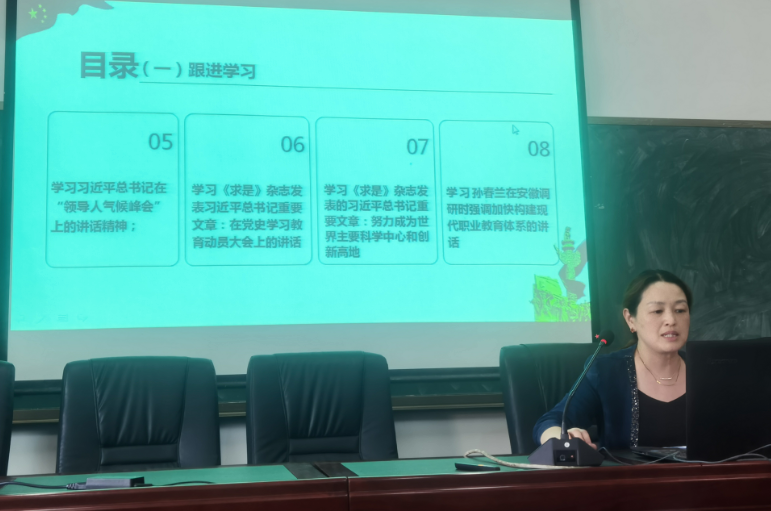 教学工作安排之后,系党支部书记尹玲组织开展系部全体教职工的政治理论学习,学习采用集中研讨与分散自学相结合的形式进行。学习内容主要包括习近平总书记近期重要讲话精神和专题党史学习教育两个方面,现场教师们认真聆听。学习结束后,大家纷纷表示要将习近平总书记的讲话精神落实到自己的本职工作上,争做新时代与时俱进的优秀好教师。