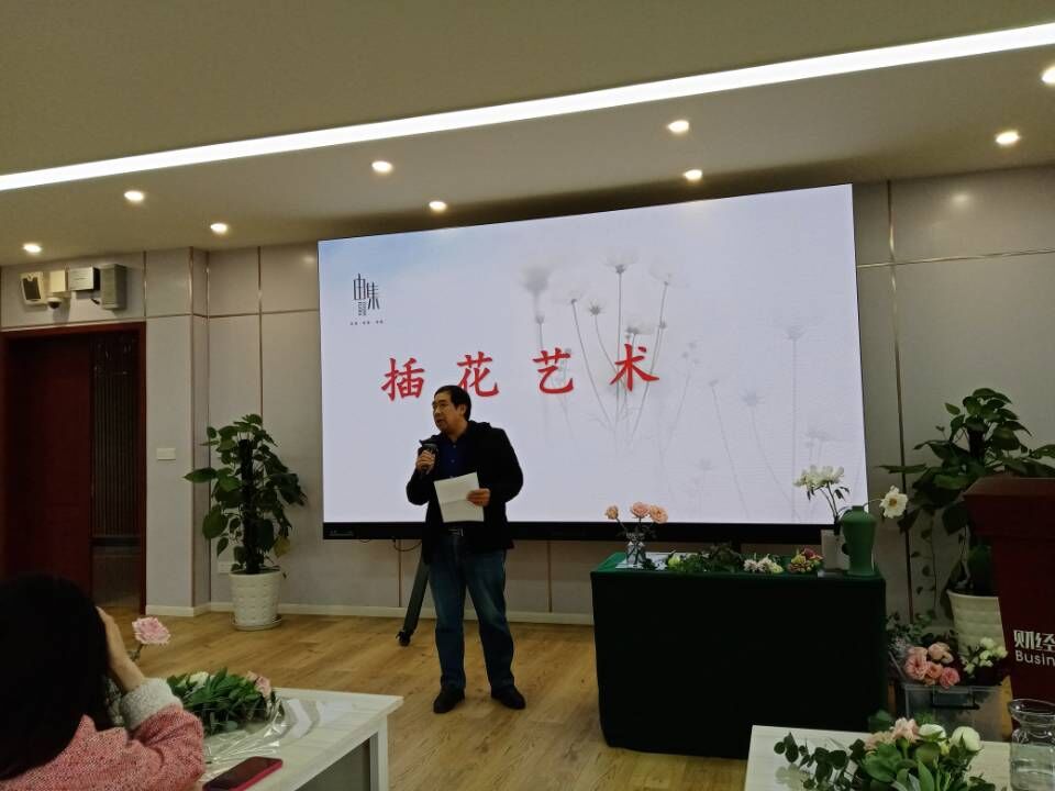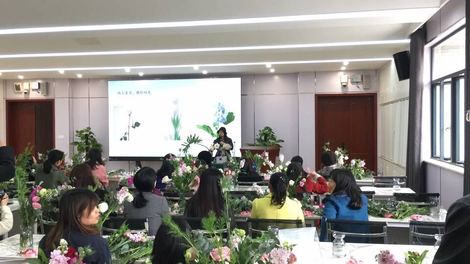 讲座中,花艺专家首先向在场的教师们传授插花技艺,并向大家讲解中国式的插花、日式插花、法式插花、现代插花等流派。随后,亲自向大家演示花器的选择、花材的选择、色彩搭配、插花的步骤及技巧、花枝修剪、造型摆放等。边讲边教边示范,带领着大家创作出了一瓶瓶春意盎然、婉约雅致、美仑美奂的插花作品。