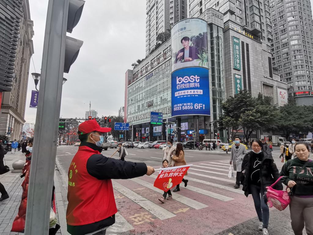 其中学院“向日葵”青年志愿者服务支队的队员,来自软件技术1902班丁俊杰和人工智能2002班的罗宏同学,在1月25日至2月5日期间,到渝中区解放碑街道,参与交通疏导志愿服务活动,引导市民遵守行路规范,消除不文明交通陋习,做到文明走路、文明骑车。为使管理规范化,解放碑街道工作人员先是对参与交通疏导的志愿者们进行了基本的业务培训。在培训会上,街道工作人员简单介绍了志愿服务活动的目的意义,详细说明了本次志愿服务的具体任务,并为志愿者们分发服装、口哨及交通疏导旗,最后带领志愿者们前往解放碑街道主要交通路口进行志愿服务工作。在志愿服务中,志愿者们面带微笑,对马路上来往的行人及车辆进行有序引导,提醒行人过马路先观察后通行,注意安全。对停留在路边的车辆进行耐心的劝导,提醒他们停放在附近临时停车场里,避免造成交通拥堵。在寒风刺骨的环境下,志愿者们依然干劲十足地认真劝导不文明的交通行为,行人和车辆也积极的配合,严格遵守交通法律法规,对志愿者们的工作表示极大的肯定。