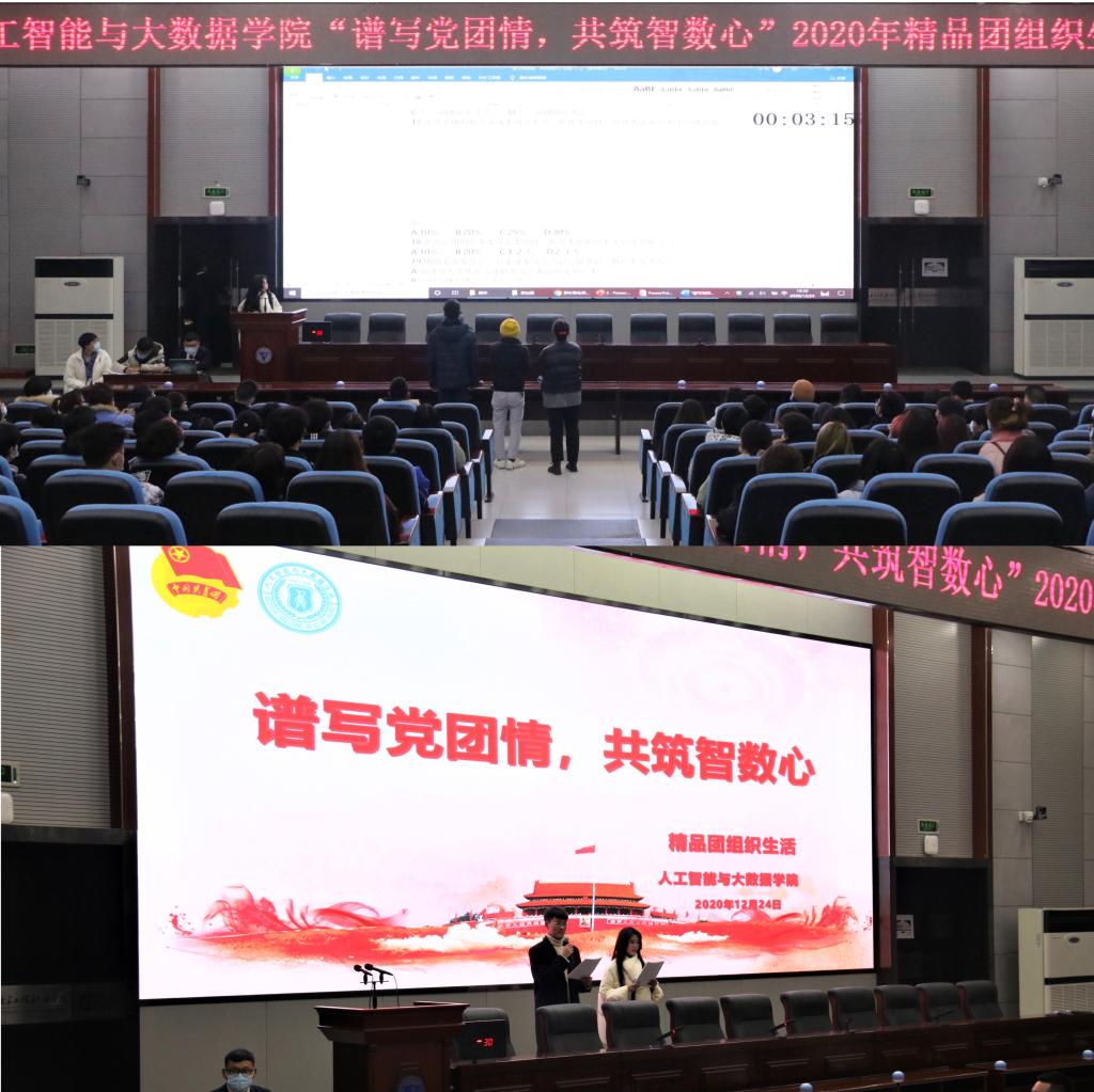 为深入开展“四史”学习教育,激发团员青年爱党、爱国热情,坚定理想信念、永葆奋斗精神,让初心薪火相传,把使命永担在肩。2020年12月24日晚18:30,人工智能与大数据学院在博远厅顺利举办主题为“谱写党团情 共筑智数心”学“四史”知识竞赛暨精品团组织生活。学院党总支书记吴焱岷、党总支副书记刘宏宇、学管科负责人白锐、团总支临时负责人王菡、大一大二全体辅导员老师、校团委主席团代表,各二级学院团总支学生会代表及学院各班级代表参加本次活动。
