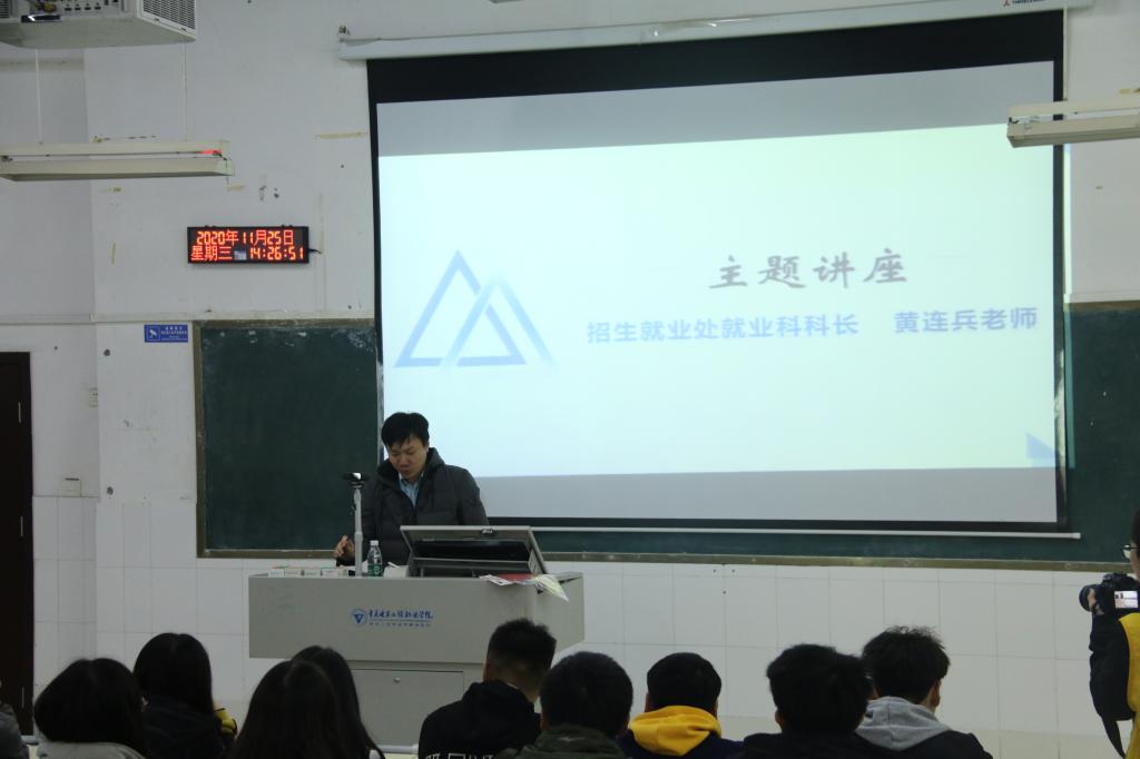 本次讲座邀请到了DMC高级创业指导师、全球职业生涯指导师、招生就业处就业科科长黄连兵老师。黄老师以幽默风趣的语言,为大家讲述了青年创业就业的相关问题,通过列举生活中的例子,生动形象地为大家解答创业就业过程中的常见问题。