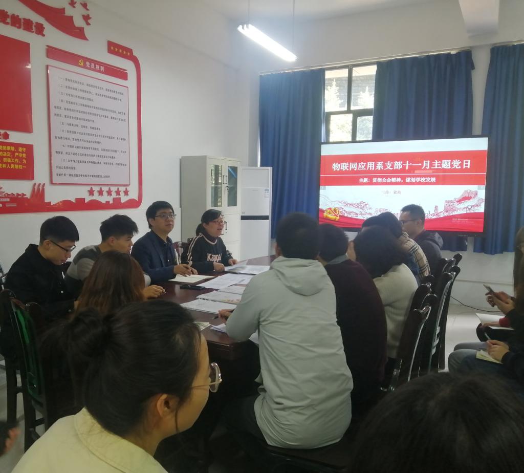 按学校组织部统一部署,物联网应用系党支部于11月19日12:30在12208开展主题为“贯彻全会精神,谋划学校发展”的党日学习。支部书记徐欣主持,全体师生党员参加学习。