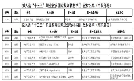 近日,教育部发布拟入选“十三五”职业教育国家规划教材书目教材名单,经单位申报、形式审查、网络和会议评审等程序,人工智能与大数据学院武春岭教授等主编的《信息安全产品配置与应用》《C语言程序设计(第二版)》等8本教材拟入选“十三五”职业教育国家规划教材书目。