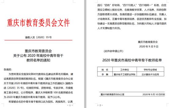 日前,由重庆市教委组织评选的2020年高校中青年骨干教师评选结果正式揭晓,我校云计算技术与应用专业带头人李腾老师荣获“2020年重庆市高校中青年骨干教师”称号。