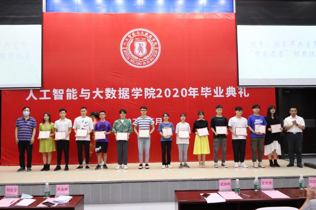 学院党总支副书记刘宏宇宣读2020届优秀、优良毕业生暨2020年“智数之星”表彰决定。此次受表彰的市级优秀毕业生13名,校级优秀毕业生23名,校级优良毕业生23名及“智数之星”5名。刘宏宇讲到,希望此次受到表彰的同学能够不忘“厚德、强能、求实、创新”的校训,再接再厉,为“中国梦”的实现凝聚青春力量。