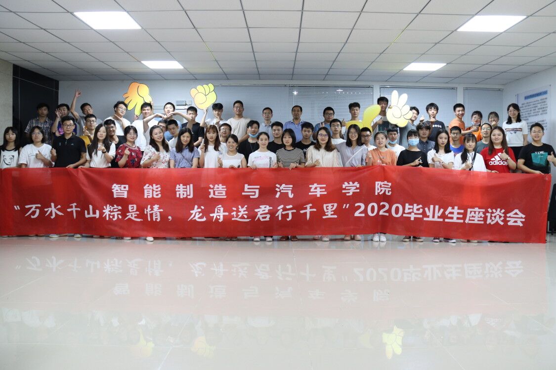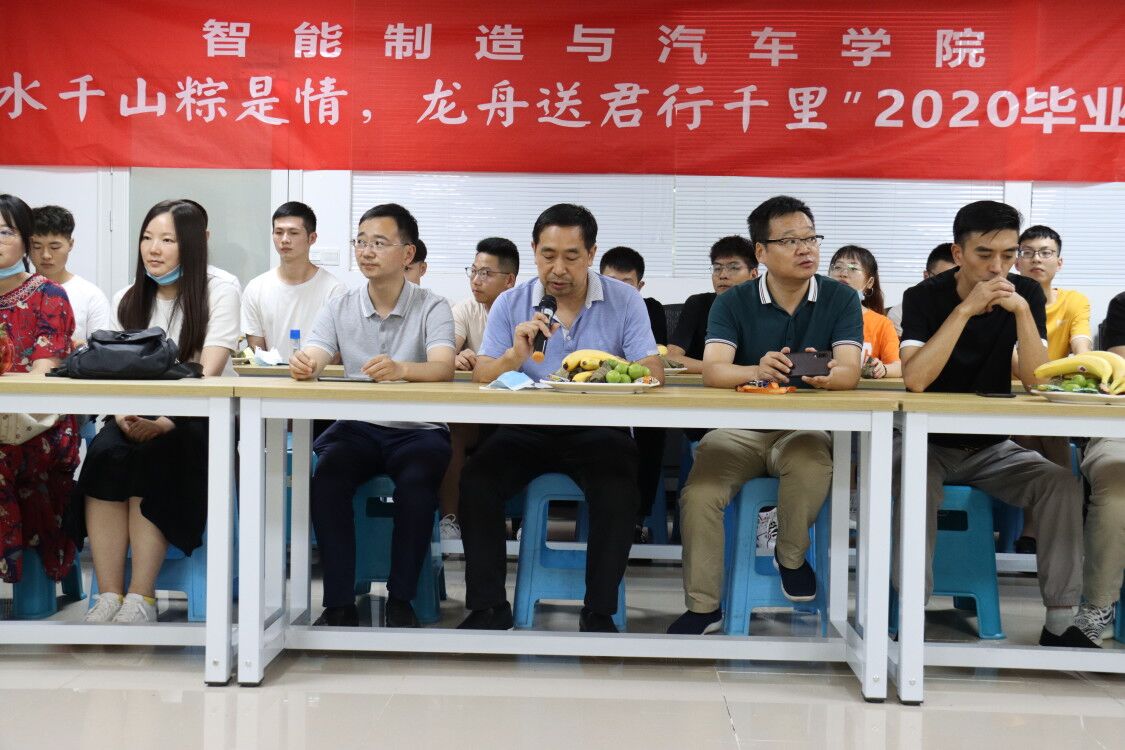 2020年6月24日下午,智能制造与汽车学院在汽车工程中心qc111教室举办“万水千山粽是情 龙舟送君行千里”2020届毕业生座谈会,学院党总支书记罗永前、院长张进春、副书记丁伟、副院长叶勇、学管科长白玥婕,团总支书记吴梁洲、9名毕业生辅导员(班主任)与30多名毕业生代表座谈交流,共叙师生情谊、共畅美好未来。