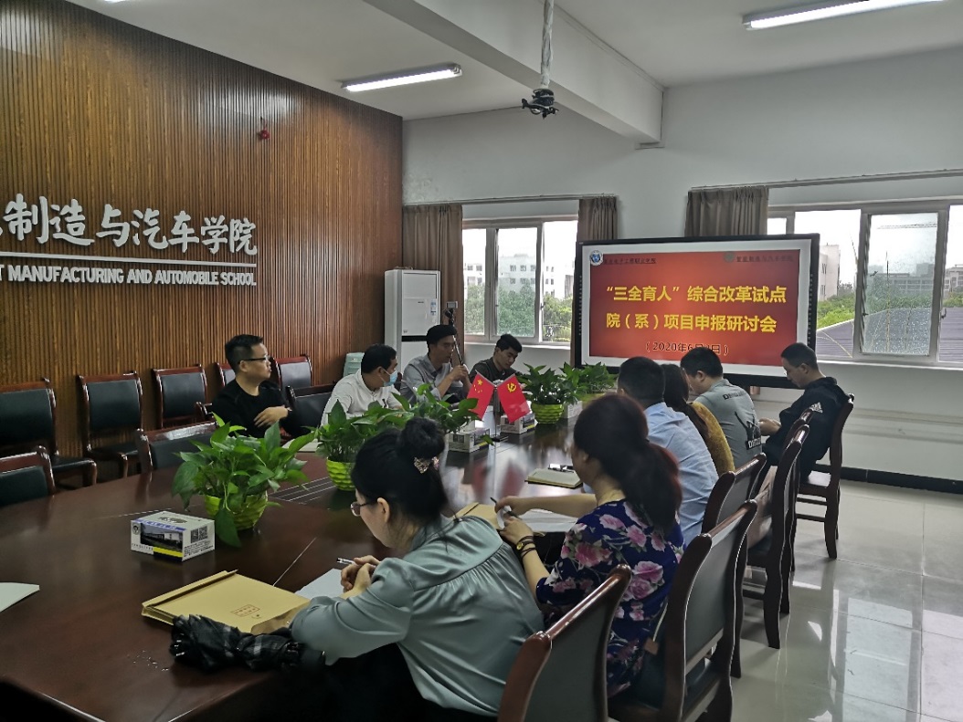 为全面贯彻落实全国高校思想政治工作会议和学校思想政治理论课教师座谈会精神,深入实施高校思想政治工作质量提升工程,认真落实市委巡视市委教育工委反馈意见整改工作和重庆市2020年教育综合改革重点任务,响应学校关于开展“三全育人”综合改革试点院(系)建设工作,2020年6月2日上午,智能制造与汽车学院在机电中心辅楼B301会议室组织召开了“三全育人”综合改革试点项目申报研讨会。