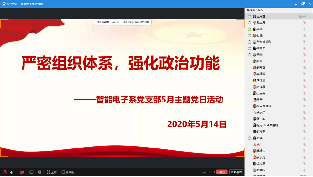 2020年05月14日,智能电子系党支部通过党支部群远程在线开展了五月主题党日学习活动。本次主题是“严密组织体系,强化政治功能”,支部书记王用鑫主持本次活动,全体党员除了1人请假外都参加了学习。
