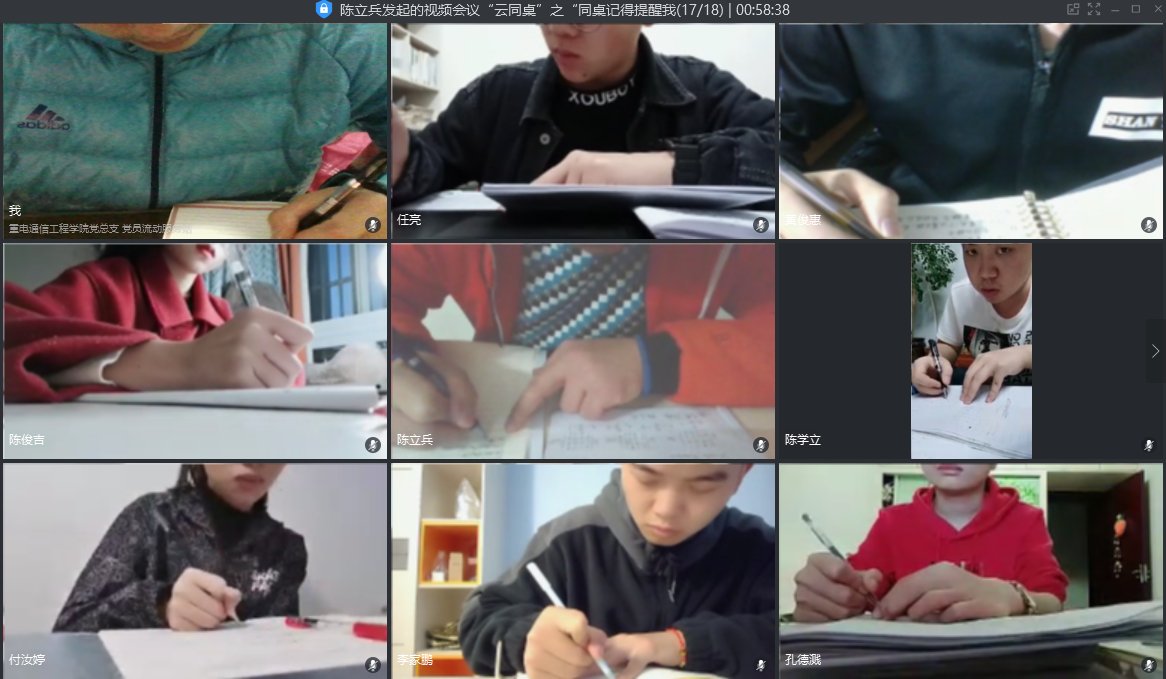 2020年4月26日,通信工程学院党员流动服务站举办了“云同桌”之“同桌记得提醒我”学习打卡活动。活动以视频会议的形式开展,遵循互相监督,携手进步的活动理念,充分调动同学们在学习上的积极性。作为入党积极分子,不仅仅要在思想上起到先锋模范带头作用,更要在行动上感染身边的同学。