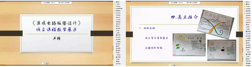 信息服务系的卢静老师以《集成电路版图设计》课程为例,分享了工具类课程线上教学难点的克服方法。针对工具差异,有电脑学生使用软件工具绘图,无电脑学生使用手绘;通过互动交流、提高课堂丰满度、加大测试度、线上数据监测、“老村长喊话”督促学习法加强课堂监测;疫情普及,爱国宣传,人文关怀润物细无声地融入课堂。