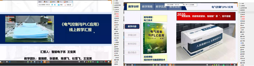 智能电子系以《电气控制与PLC应用》课程为例,由王宝英老师从教学分析、教学策略、教学过程、教学反思四个层面进行经验分享。王老师以突发疫情,防疫物资紧缺为导线,将口罩生产与课程知识相结合,以岗位任务实施为主线,以企业实际项目任务为载体,确立导、思、展、调、评五个教学过程的教学模式。以项目化教学方式培养学生自动控制的逻辑思维和编程能力,提高学生分析问题解决问题的能力。同时,将思政教育有机融入课堂教学中,培养学生的家国情怀、敬业精神、创新意识。