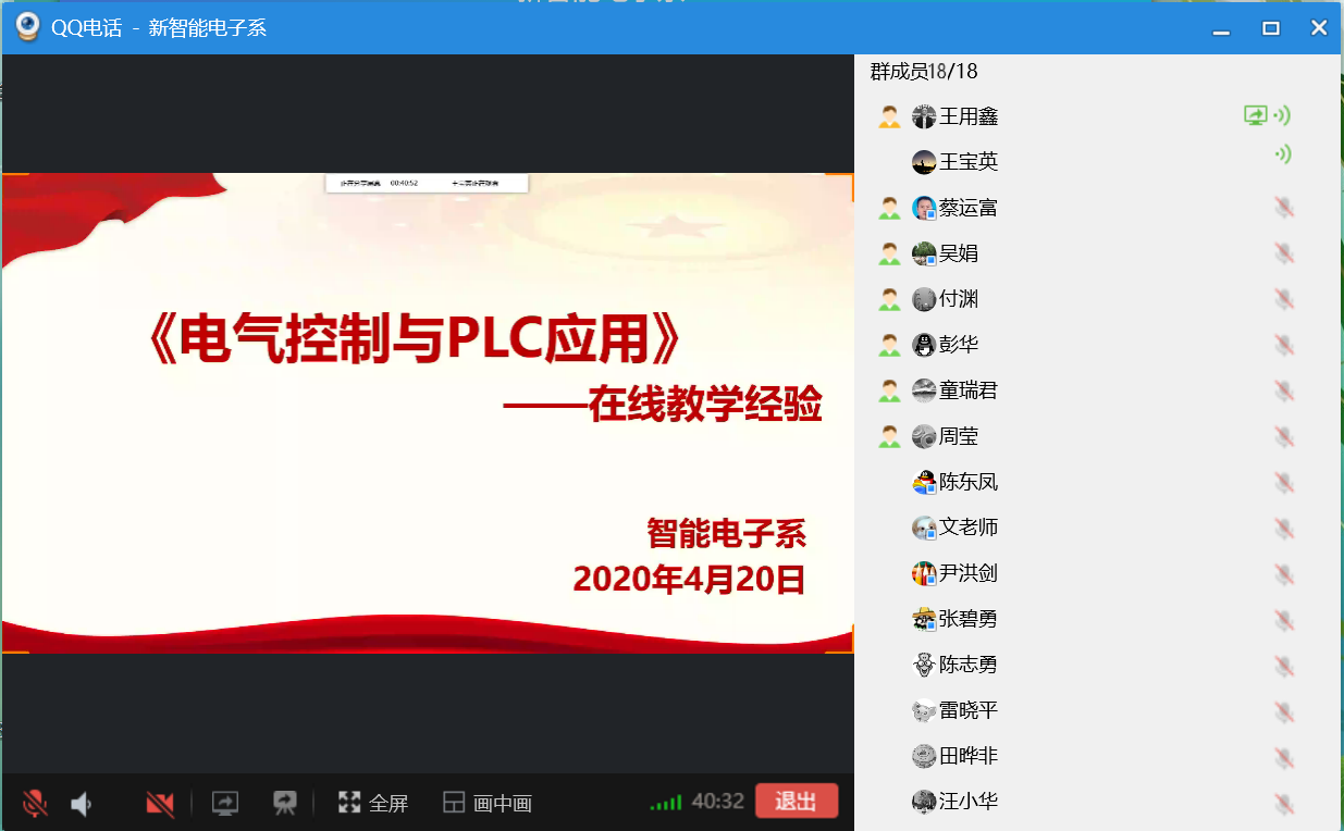 近两个月的线上教学,智能电子系课程团队积累了一定的教学经验,为了更好地交流与推广,以《电气控制与PLC应用》课程的线上教学为例。4月20日由王宝英老师代表课程团队,智能电子系全体教师参加,进行了分享与交流。