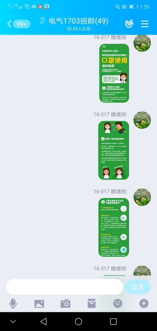 科学是战胜疫情的良方,自获知疫情信息以来,电气1703班团支部通过视频会议、分享防疫小知识等方式,带动支部成员学习疫情防控有关的政策和科学知识,关注最新疫情动态,让每个成员在疫情防控工作中做个“明白人”。同时,学习委员谭云飞和寝室长易鑫积极当起了科普员,通过QQ群消息转发防疫知识,告诉同学们如何阻断病毒传播,如何避免交叉感染,要相信科学,遵从政府的决定,从自身做起,讲究卫生,学好病毒预防知识。同时也让同学们明白,国家兴亡,匹夫有责,世间若有岁月静好,那一定是有人在替我们负重前行。