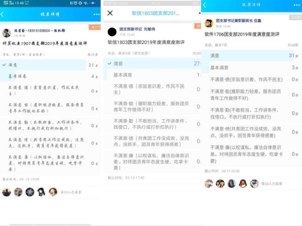 新冠病毒引起的肺炎牵动每个人的心,隔离病毒却隔离不了责任心和爱,虽未返校,工作仍在继续。近期,为进一步落实全面从严治团要求,通过“工作好不好,群众说了算”的评价机制,加强我校我院团支部书记队伍建设,提升团组织先进性,根据《关于印发〈团支部书记年度满意度测评工作实施办法〉的通知》《共青团重庆电子工程职业学院委员会关于组织实施2019年度团支部书记“背靠背”满意度测评工作的通知》要求,我院各班级团支部在特殊时期,通过网络,在线上组织召开了团支部书记2019年度满意度测评,整个测评历时18天,于2020年3月27日完成全部测评及汇总工作。