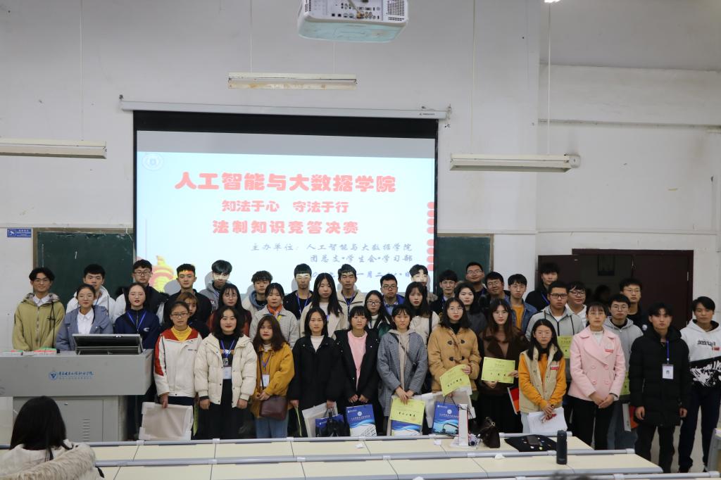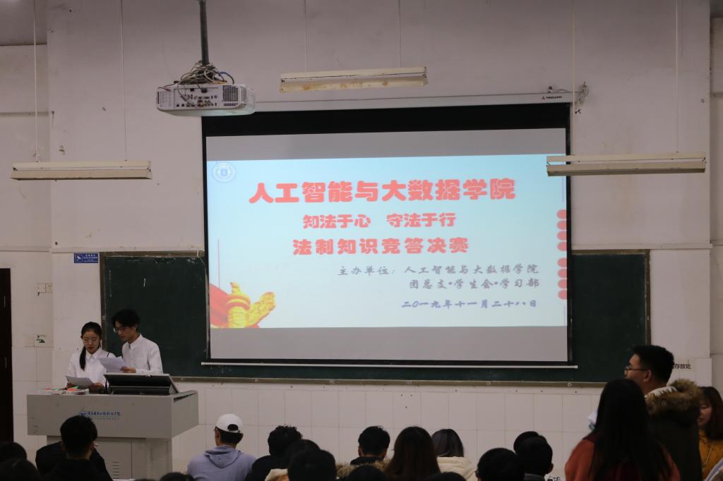 为普及法律常识,提升学生法律意识,培养学法、知法、懂法、守法的中国特色社会主义合格建设者和可靠接班人,建成平安校园、和谐校园、法制校园,11月28日中午12时20分,人工智能与大数据学院团总支·学生会学习部主办的“知法于心,守法于行”活动决赛在南校区7-208圆满举办。