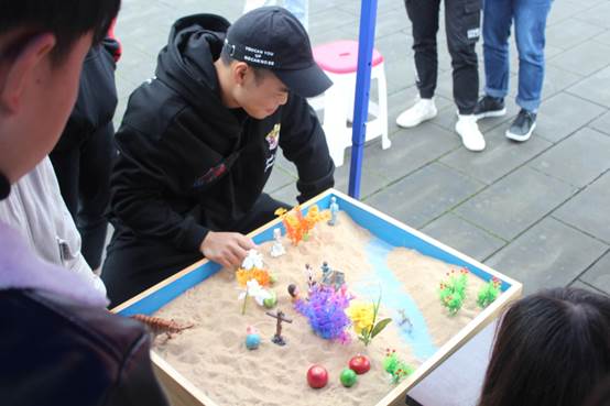在活动现场,干事们热情得为大家介绍沙盘,并带大家感受沙子从指间缓缓流出,用心摆放人物、动植物、房子、交通工具等等,创造出内心小小世界。