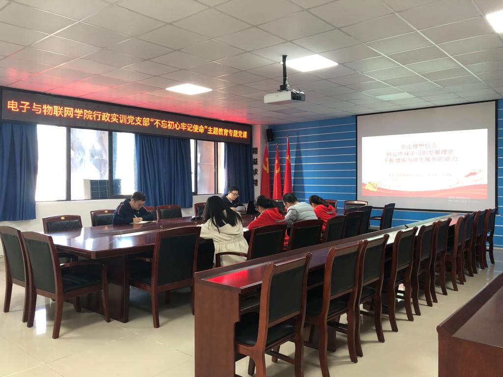 11月14日下午13:30,电子与物联网学院党总支行政实训党支部召开支部书记讲党课学习活动。在“不忘初心、牢记使命”主题教育学习背景下,本次党课主题为“坚定理想信念,树立终身学习的发展理念,不断增强为师生服务的能力”,廖金权同志为主讲人,支部6名党员参会学习。