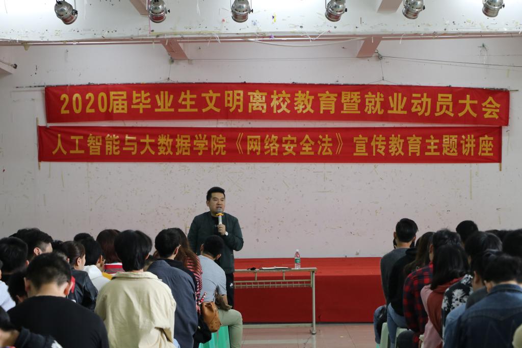 2019年10月17日下午14:00,人工智能与大数据学院在北区学生活动中心召开了2020届毕业生文明离校教育暨就业动员大会。学院党总支书记吴焱岷、副书记刘宏宇、学管科长白锐、毕业生辅导员代表程瑞雪分别为2020届毕业生进行了4场文明离校教育。此次离校教育旨在进一步确保毕业生安全有序离校,增强学生对母校的认同与感恩意识,指导学生更好步入社会,顺利就业。