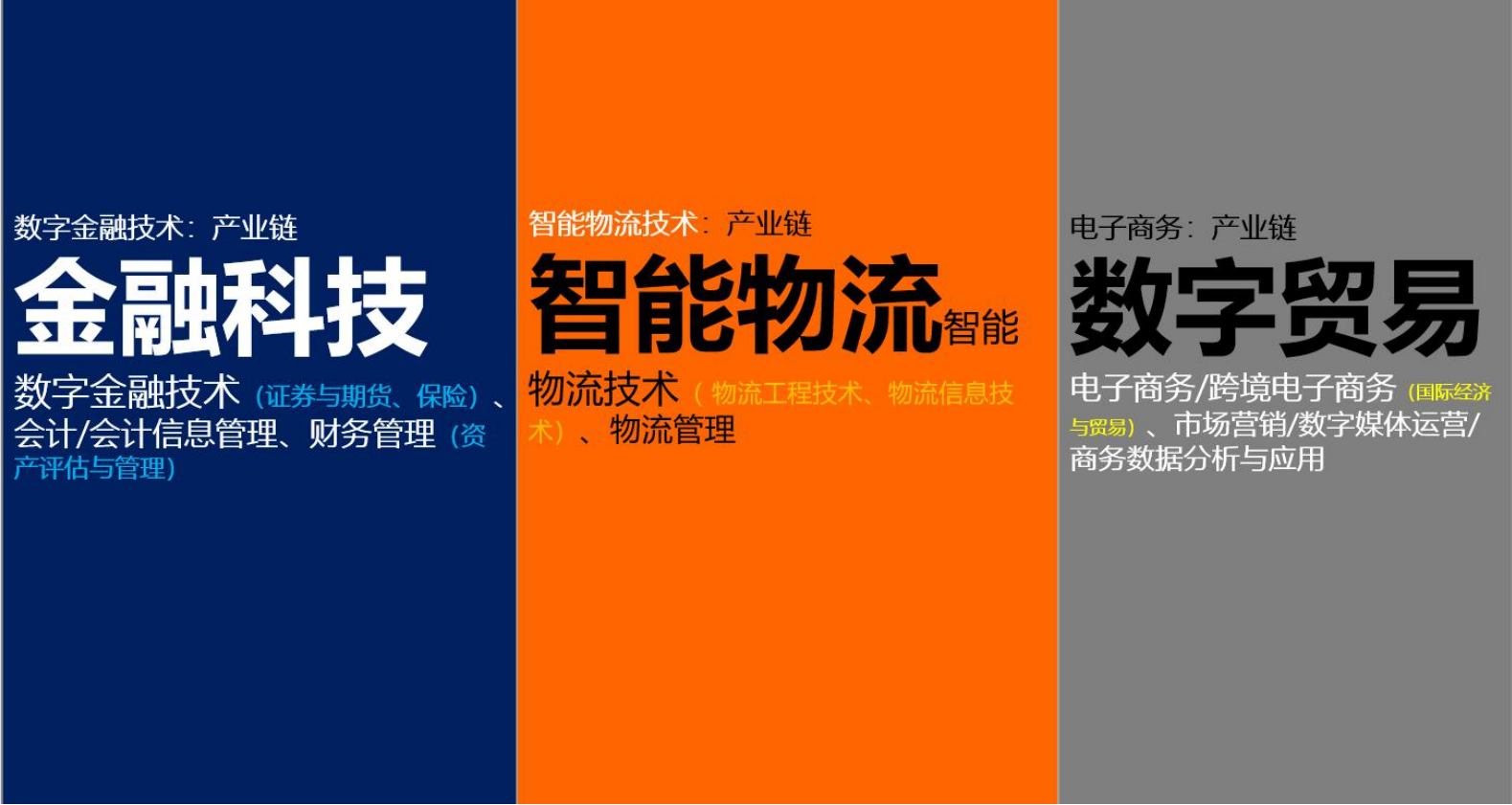 学院将所有专业整合聚焦为金融科技、智能物流和数字贸易三大专业群,积极拥抱以人工智能、大数据升级改造既有产业的发展思路,以技术引领专业提档升级。