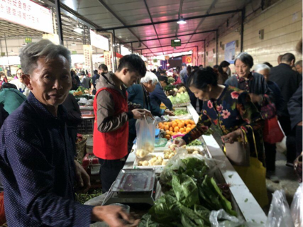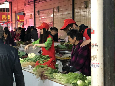到达陈家桥菜市场后,每一个志愿者们都分配到了自己的任务,用一个志愿者的真心去帮助每一位卖菜的老人,帮助老人们装菜、算账。