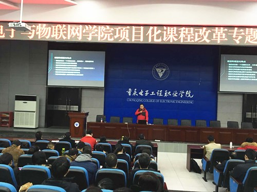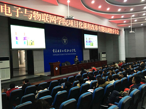2019年1月20日上午,电子与物联网学院在博远厅举行了项目化课程改革专题培训暨分享会。本次活动旨在改变传统的学科系统化课程体系与知识传授型的教学模式,贯彻“学生中心、能力本位、工学一体”理念,进一步深化教育教学改革,切实提升教师职业能力,全面提高课程质量。此次活动邀请了我院陈良院长、高小梅、武新和李靖四位教师分享与传授项目化课程改革的经验与做法。学院全体教职工参加了本次活动。