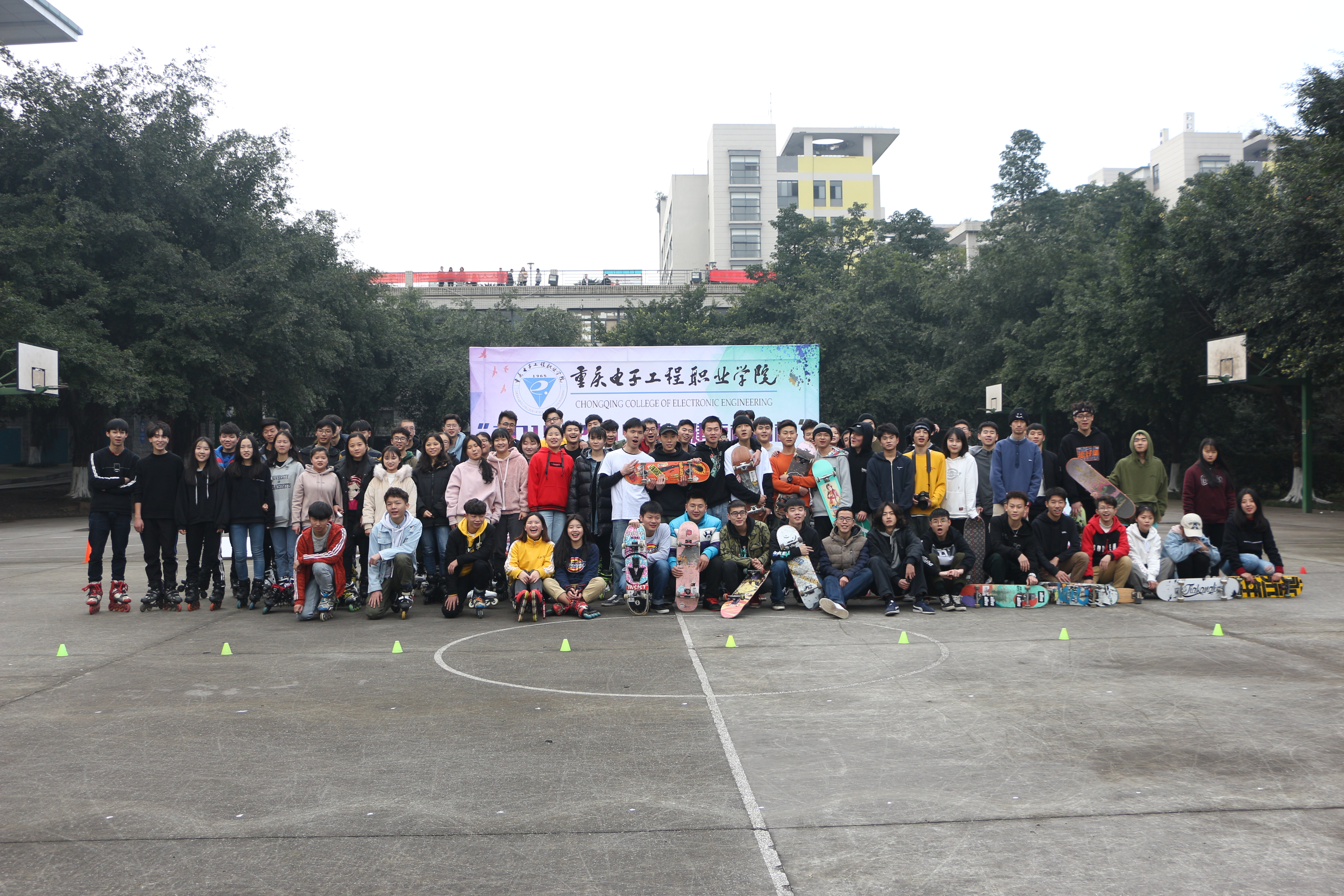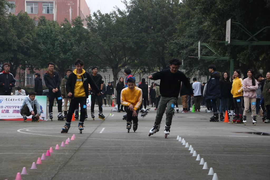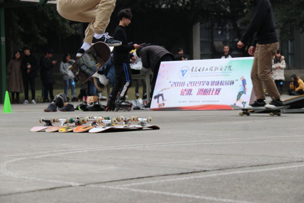 由党委学生工作部、体育与国防教学部主办的重庆电子工程职业学院“2018-2019学年健康校园杯”轮滑、滑板比赛于2019年1月11日下午在南区篮球场如期举行。举办此次比赛旨在以健康校园为契机,丰富校园体育文化生活、促进各学院学生交流和学习;并为学生提供展示自我魅力,弘扬青春风采的平台;在校园内推广轮滑、滑板运动,让更多的学生参与其中。