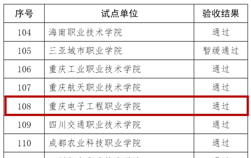 1月3日,教育部在《关于公布现代学徒制第一批试点验收结果和第二批试点检查情况的通知》(教职成司函[2018]187号)中公布,我校等124家首批国家现代学徒制试点项目单位通过部级验收。2015年8月,我校光电显示技术等6个专业立项为国家首批现代学徒制试点专业,2017年6月通过中期检查,2018年7月通过重庆市教委的网络验收和现场考察,2018年8月将验收材料提交至教育部。