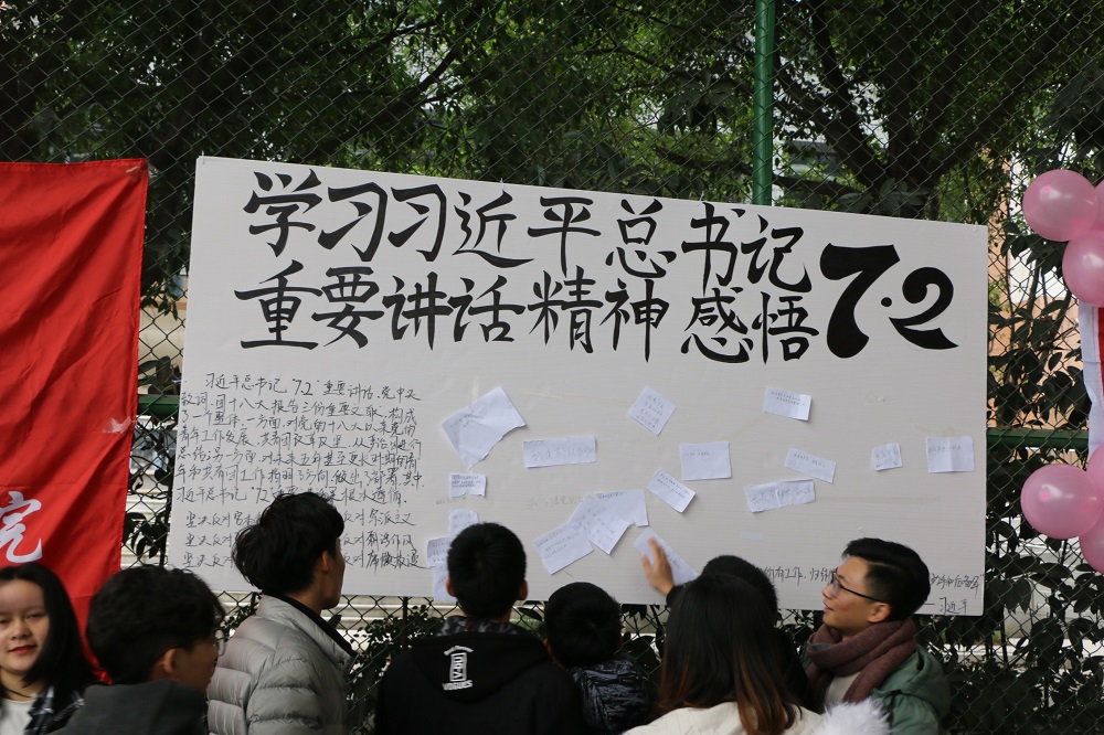 随后进行了针对“7.2重要讲话精神”内容的知识竞赛及筷子夹弹珠等游戏环节,在主持人介绍完比赛流程与规则后,比赛正式拉开帷幕。知识竞赛分为个人抢答与部门抢答环节,在规定时间内答对题数多的队伍获胜。在个人答题中,选手们思路清晰,自信应答,现场气氛热烈,每位同学都展现出了自己的风采。在部门答题中,同学们也信心满满、从容不迫、对答如流。其中,学生会办公室部门凭借扎实的知识储备与良好的心理素质脱颖而出。紧接着的是筷子夹弹珠比赛,共分为两人一组。参赛者一个接一个上台比赛,“哎呀,好不容易夹起来了,怎么又掉下去了嘛”,“好,慢点,就这样。”参赛者们一边说笑,一边用筷子将放在盆中的玻璃弹珠夹起放到自己手中的盆子里,整个气氛轻松活泼。活动结束之际,同学们写下了对本次活动的思想感悟,粘贴在KT版上,纷纷表示将不忘初心、牢记使命,紧跟党走,谨记习近平总书记的谆谆教诲。