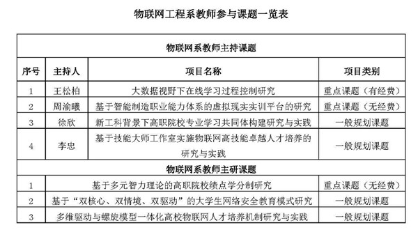 在本次重庆市教育科学“十三五”规划2018年度课题申报中,重庆电子工程职业学院总计立项22项,电子与物联网学院物联网工程系参与立项的课题数高达7项,占学校总立项数的31.8%,其中,有经费的重点课题1项,无经费的重点课题2项,一般规划课题4项,参与人数超过20人次。本次科研项目立项工作取得突破,与电子与物联网学院长期重视教学改革、努力实现教学创新分不开。物联网工程系将继续扎根教学研究,立足应用实践,提高团队教师的教学研究能力,提升物联网的教学科研工作水平。