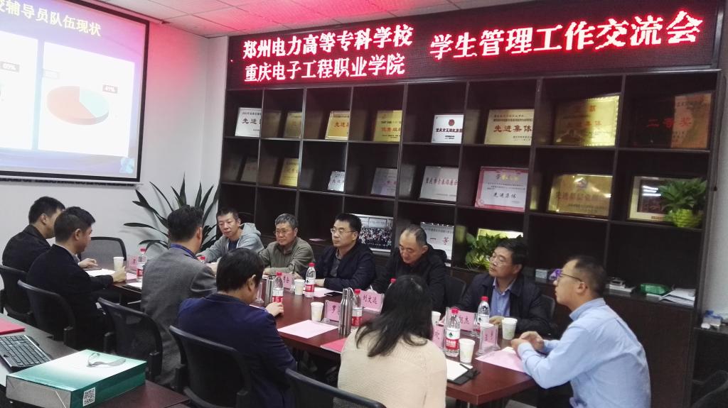 双方在博德楼7201会议室进行了座谈。蒋斌副部长代表学校对曹秀会部长一行的到来表示欢迎,然后介绍了我校的历史沿革、改革发展和学生教育管理工作等情况。郑州电力高等专科学校曹秀会部长对我校热情接待表示感谢,希望两校增近交流,相互学习。会上,两校代表还就学生日常工作、院系两级管理、辅导员队伍建设、学生资助工作和安全稳定等工作进行了深入交流和探讨。