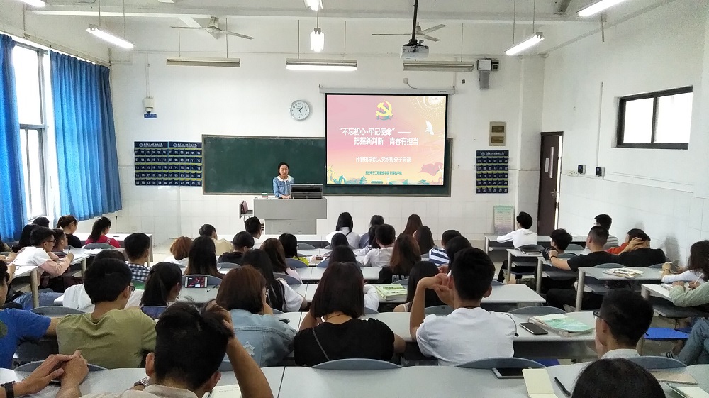 为帮助入党积极分子青年学生进一步坚定理想信念,加深对党的了解,端正入党动机,熟悉入党流程,思考并认识作为新时代青年的担当和使命。2018年4月27日,计算机学院在南区7-115教室开展了“不忘初心、牢记使命——把握新判断青春有担当”入党积极分子主题党课教育活动,此次党课由学院党总支青年委员、辅导员黄婧雯老师主持,学院新确定的21期全体入党积极分子参加。